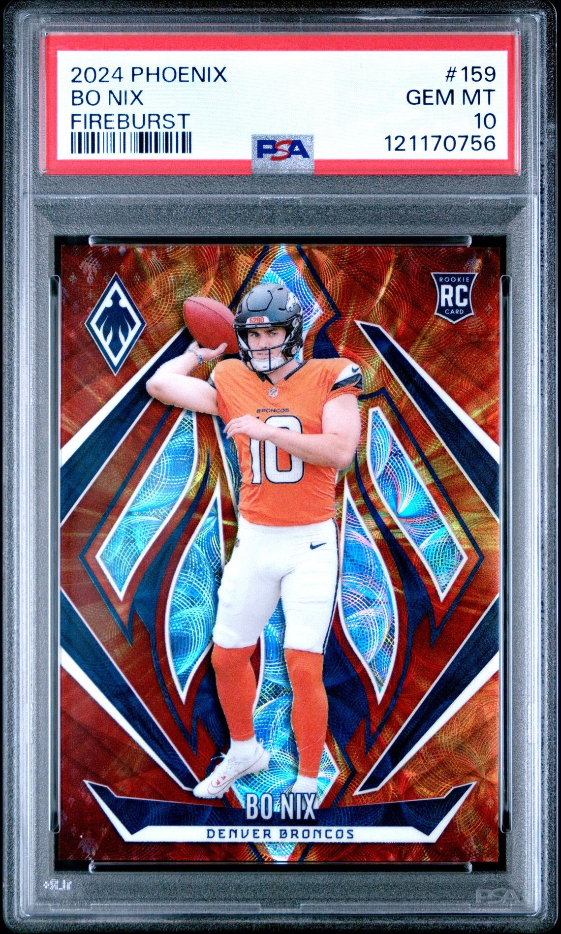 This is a serial-numbered Fireburst Rookie /350 of Denver Broncos quarterback Bo Nix, professionally graded PSA 10 GEM MINT. With only 350 copies produced, this is one of the key early rookies for one of the most talked-about QBs of the 2024 NFL Draft class.