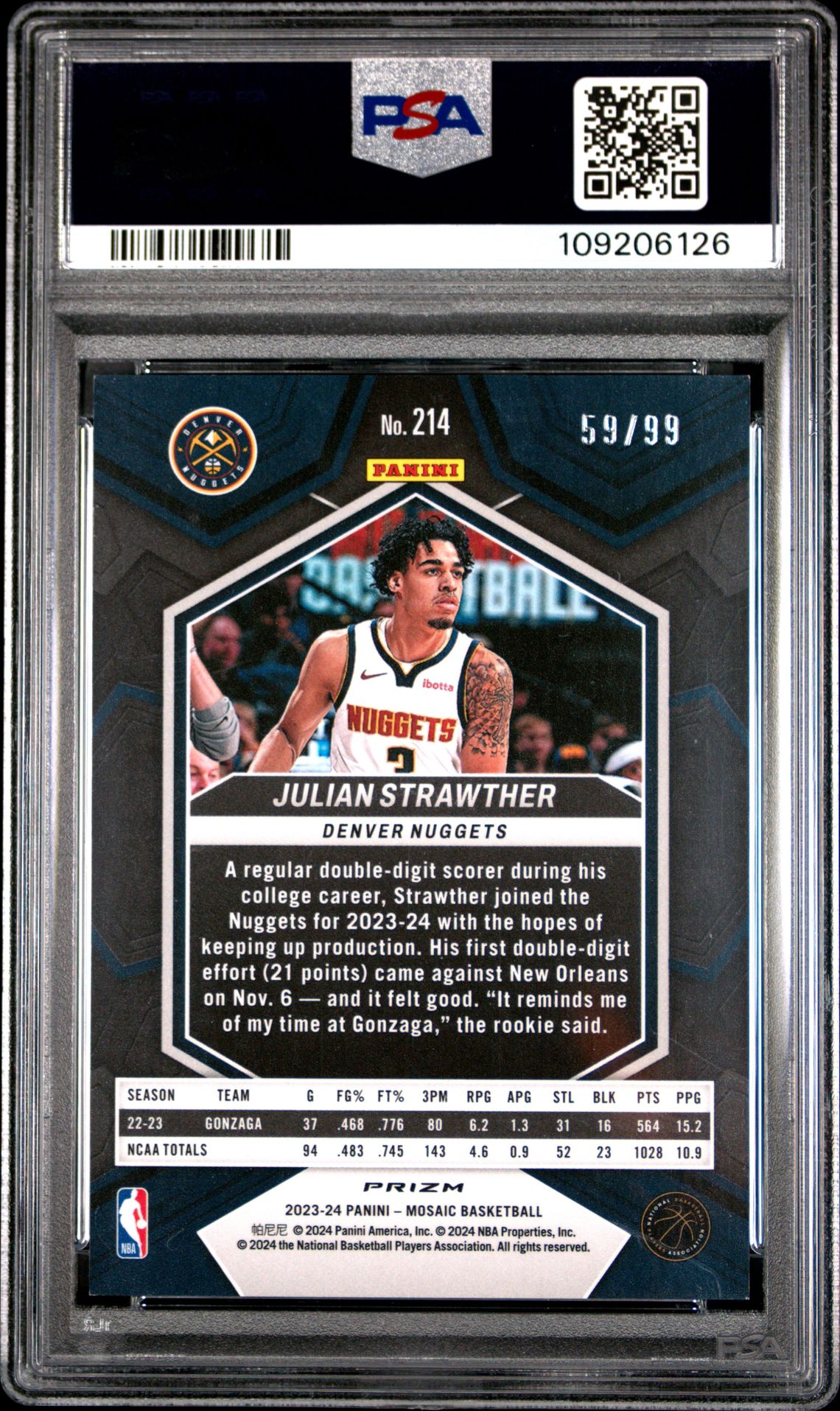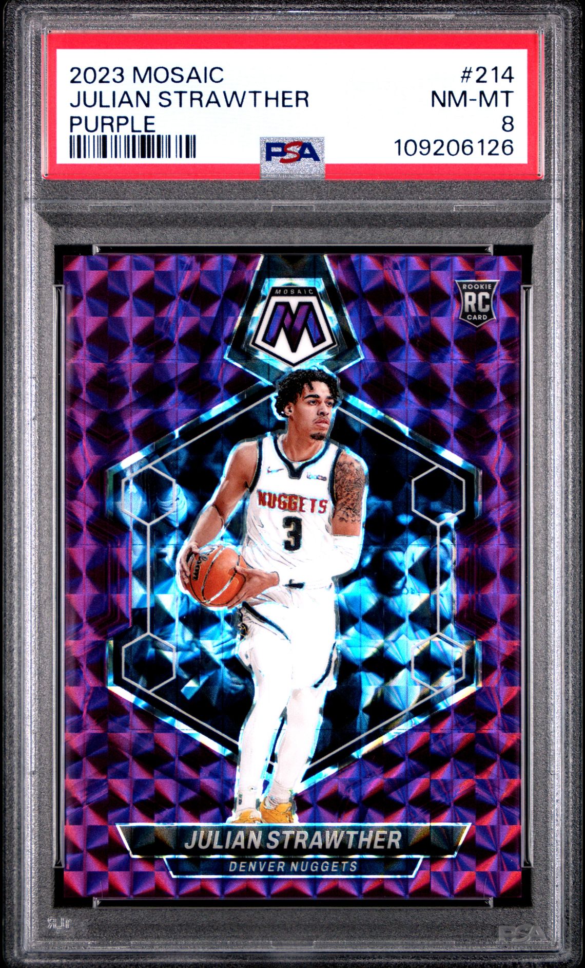 This is a serial-numbered Purple Prizm Rookie Card /99 of Denver Nuggets young talent Julian Strawther, graded PSA 8 NM-MT.